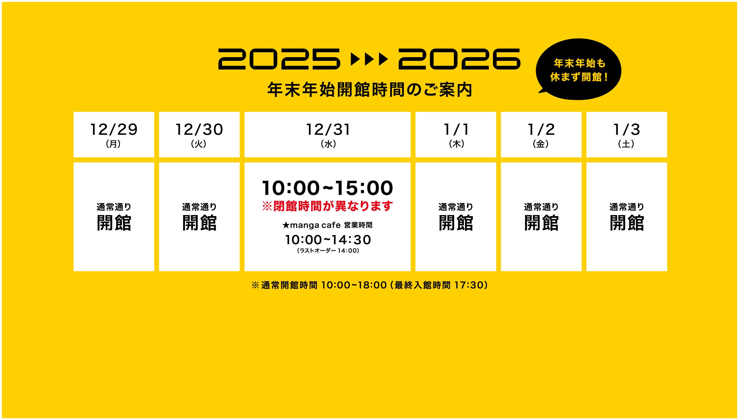 ※マンガ原画アーカイブセンター(漆蔵資料館)も同様(12月31日は15時閉館、他は通常通り開館(10:00~17:00))となります。