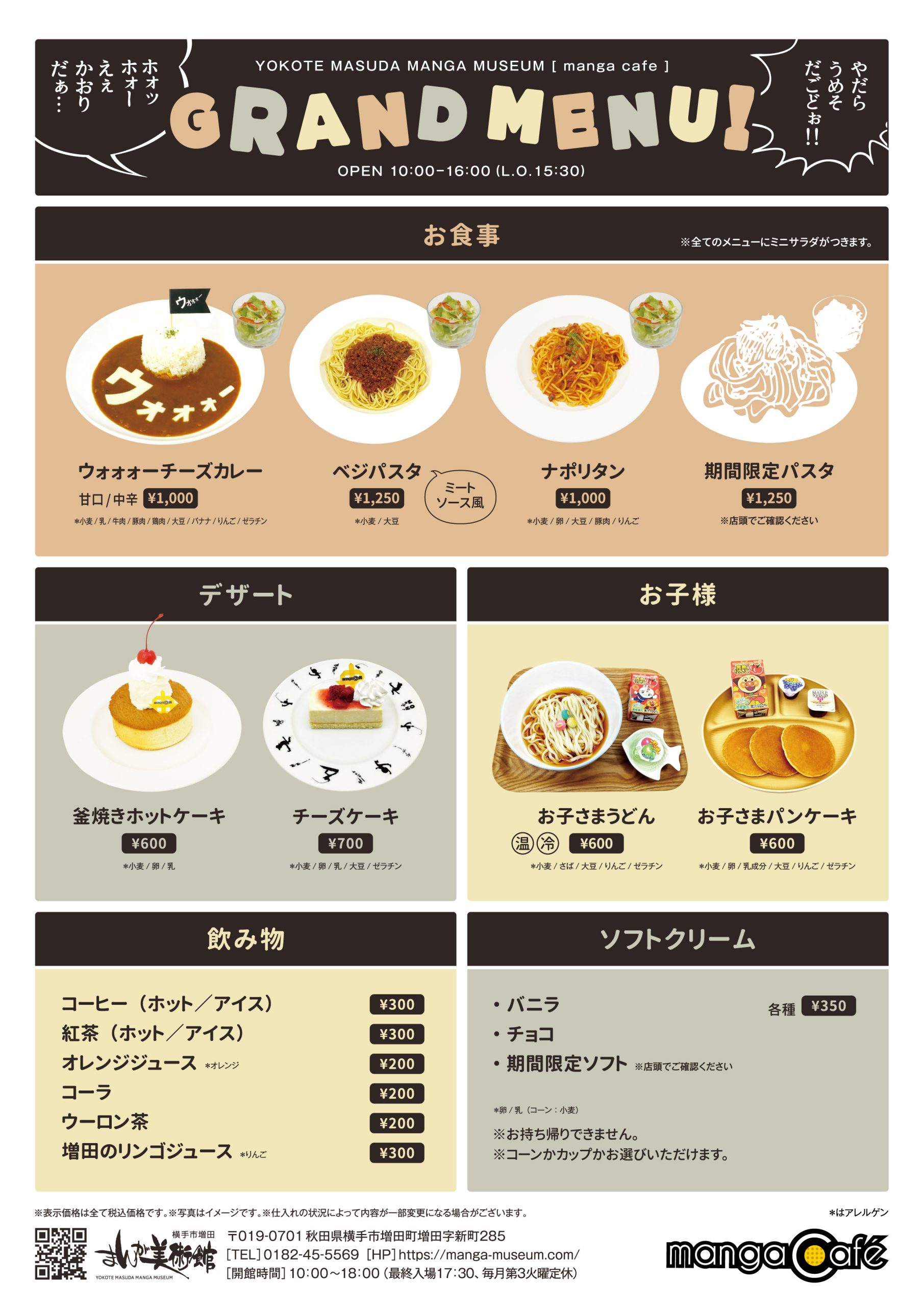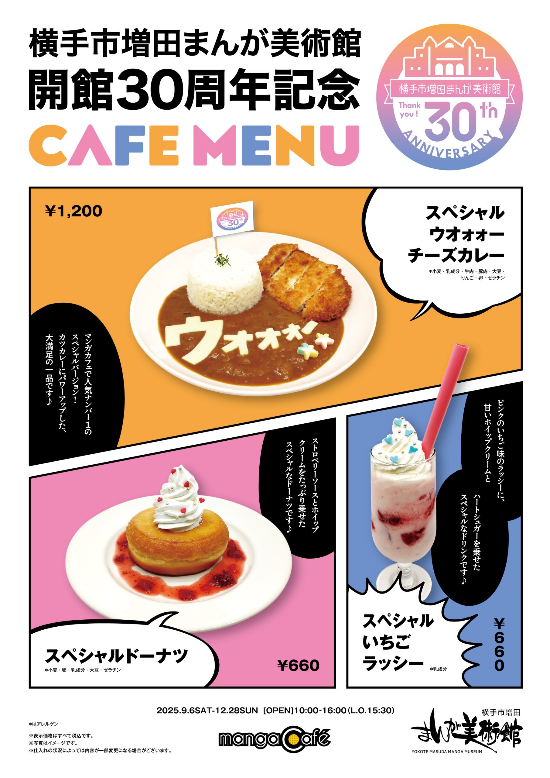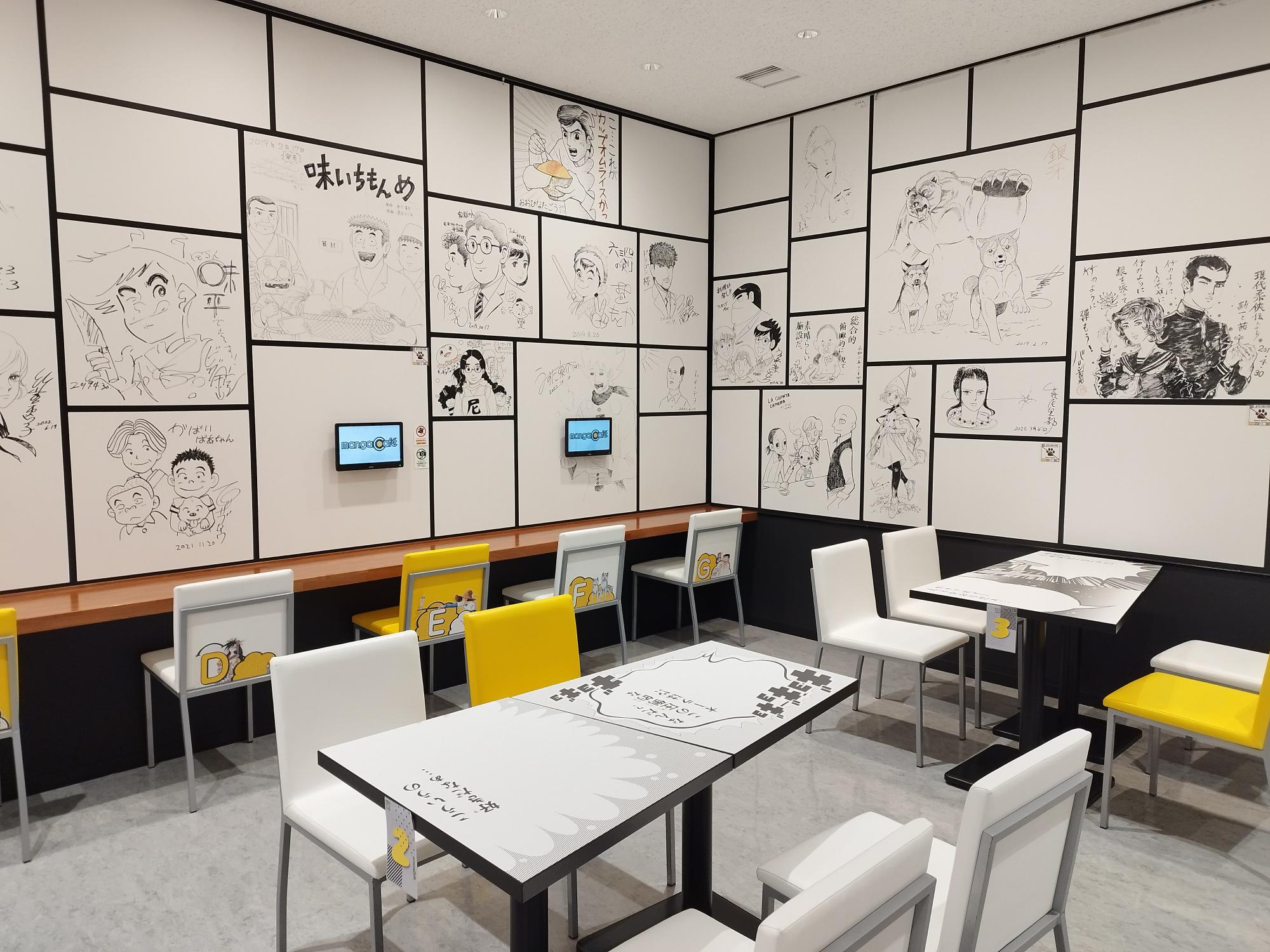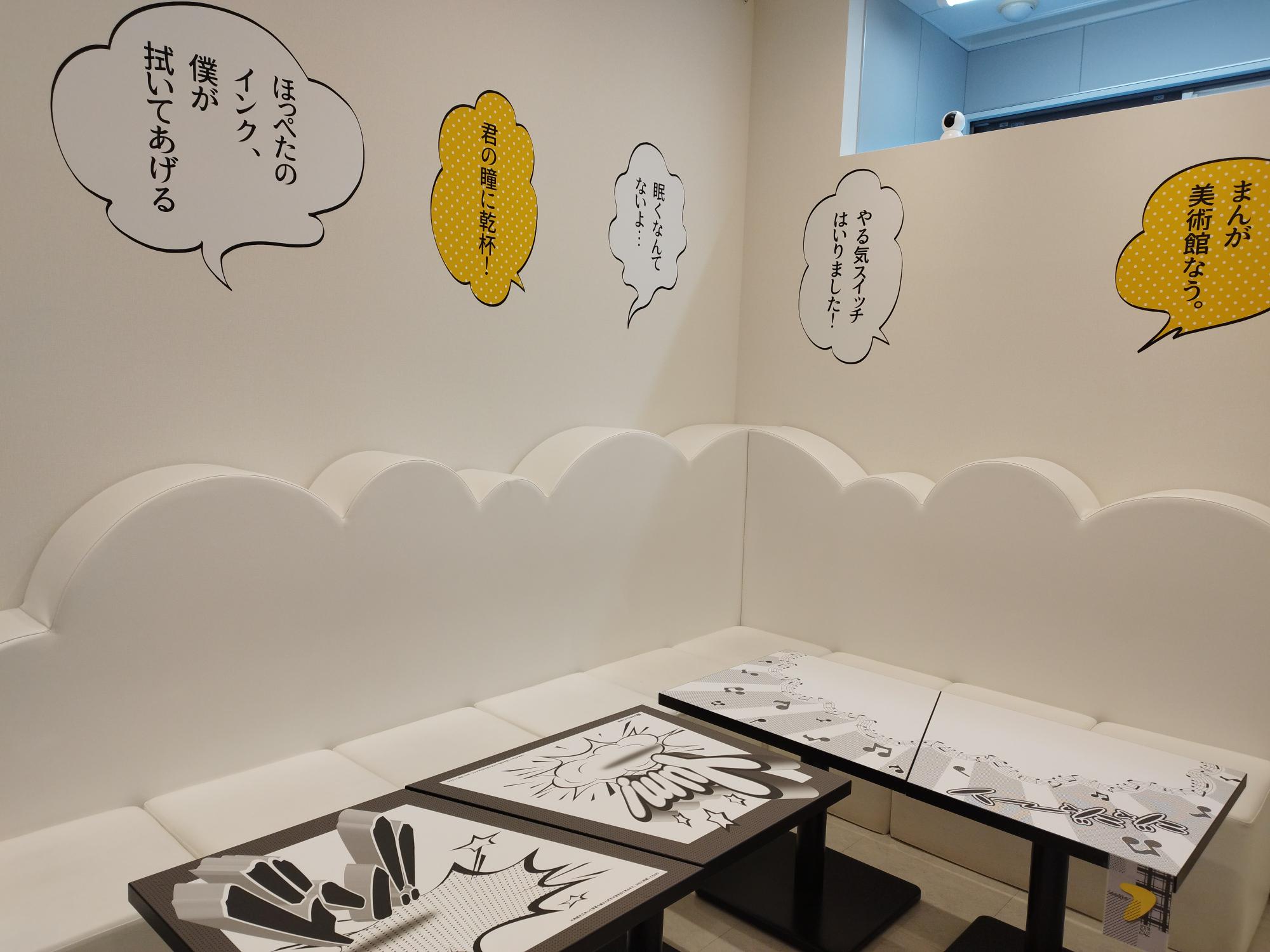 マンガカフェには、壁からテーブルまでフォトジェニックな仕掛けが満載です。中でも壁の空白のコマは訪れた作家たちが自由に描き、徐々に埋めていく仕組みになっており、迫力ある作家の生の絵に囲まれた空間で食事やスイーツが楽しめます。季節限定のメニューや、特別企画展と連動したコラボメニューも提供していますので、どうぞお気軽にご利用ください。