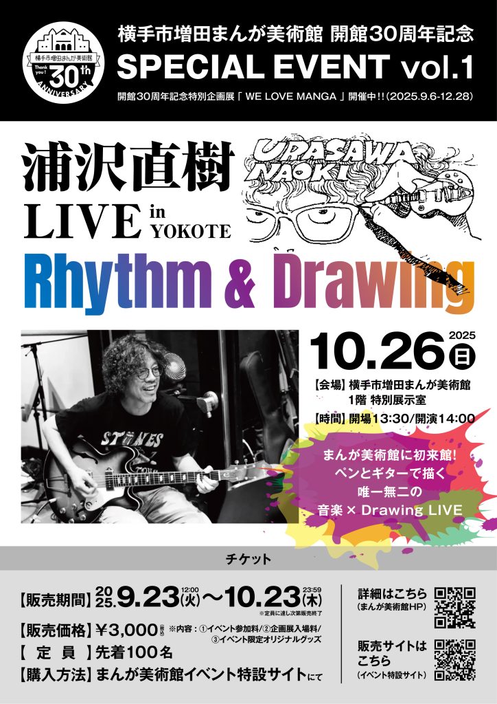 横手市増田まんが美術館開館30周年を記念したイベント第1弾として、漫画家・浦沢直樹氏をお招きし、音楽ライブとライブドローイングをかけあわせた「浦沢直樹LIVE Rhythm&Drawing in YOKOTE」を開催いたします。